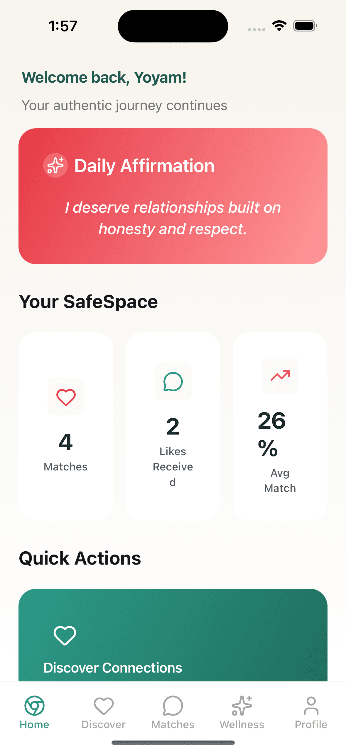 SafeSpace includes a mood tracker, a private journal, and daily affirmations. We believe how you feel about yourself directly affects how you connect with others.
